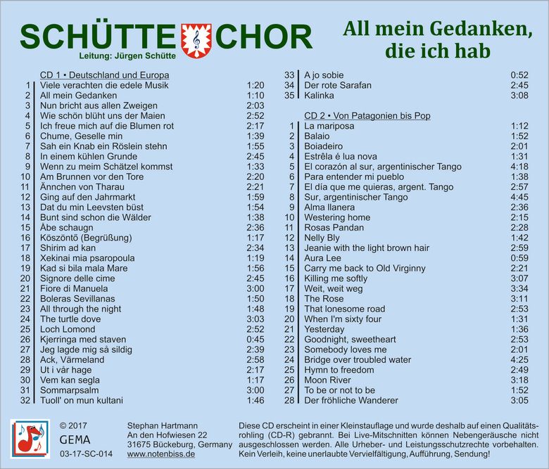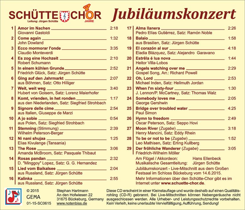 Die CD enthält Ausschnitte aus dem Jubiläumskonzert "40 Jahre Schütte-Chor" im Großen Festsaal im Schloss Bückeburg vom 14. Juni 2015.
