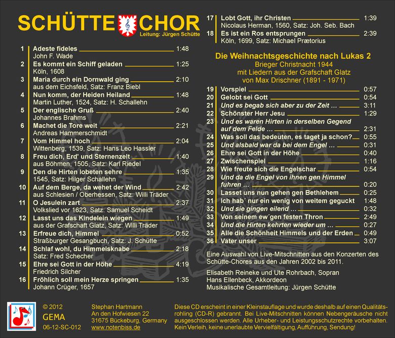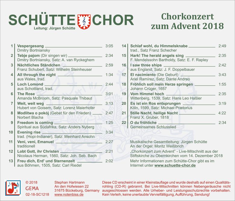 Die CD enthält enthält das Adventskonzert des Schütte-Chores in der Stiftskirche Obernkirchen vom 14. Dezember 2018.