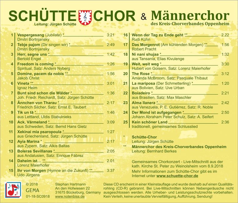 Die CD enthält enthält das gemeinsame Konzert am 8. September 2018 in der Katholischen Kirche zu Weinolsheim.