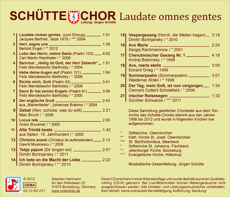 Seit 1999 werden besondere Konzerte des Schütte-Chores digital mitgeschnitten und archiviert. Von diesen Aufnahmen entstand in den letzten Jahren eine kleine exklusive Kollektion von CDs, die nicht im Handel erhältlich ist.